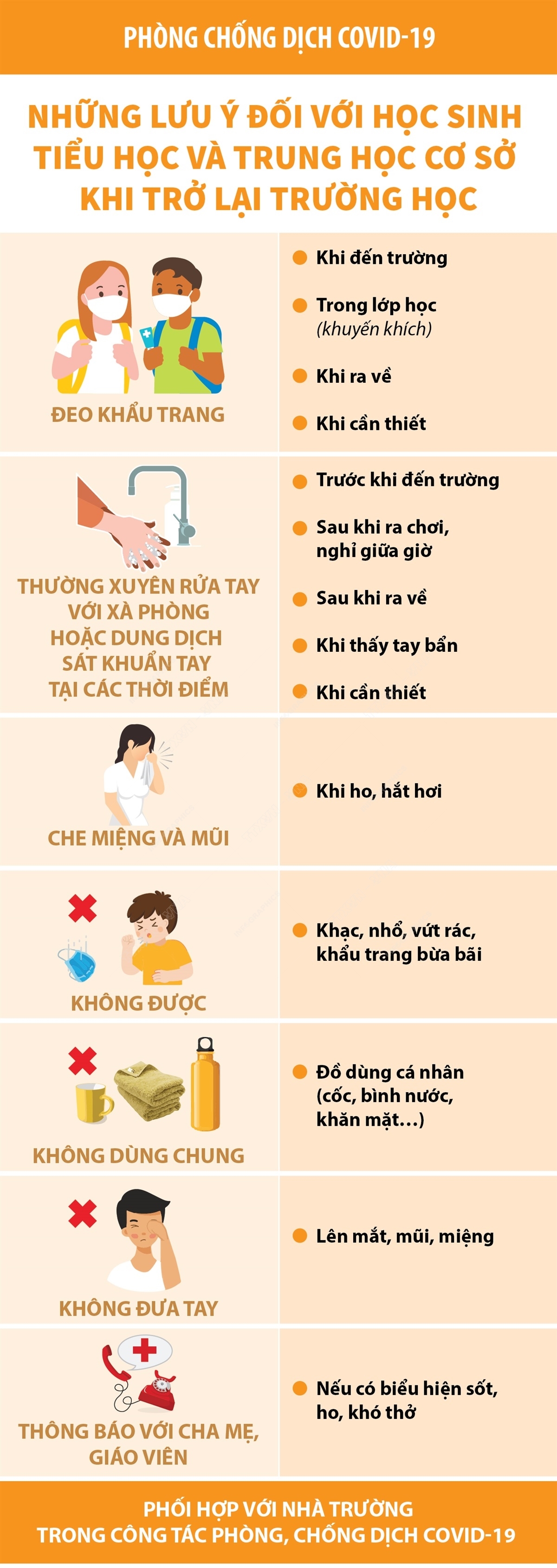 Học sinh tại trường tiểu học và trung học cơ sở (THCS) cần đeo khẩu trang khi đến trường, trong lớp học (khuyến khích), khi ra về, khi cần thiết thường xuyên rửa tay với xà phòng hoặc dung dịch sát khuẩn tay, không dùng chung đồ dùng cá nhân...