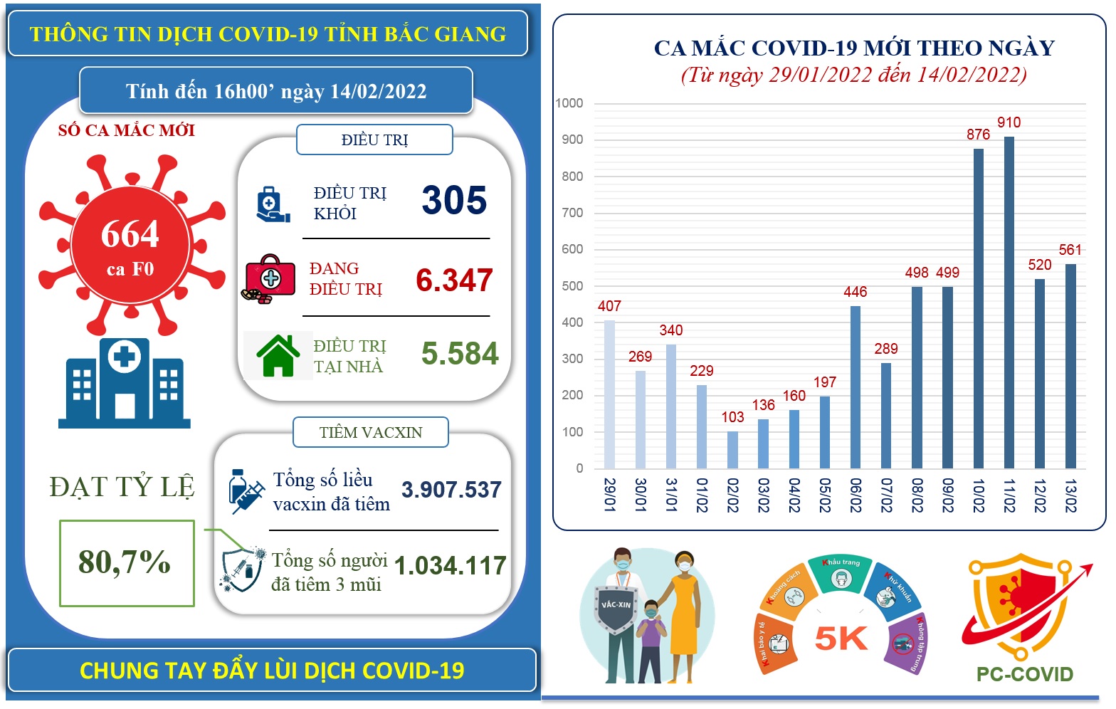 Theo Sở Y tế, đến 16h00’ ngày 14/02/2022, trên địa bàn tỉnh Bắc Giang ghi nhận thêm 664 ca mắc mới COVID-19 (ca F0).
