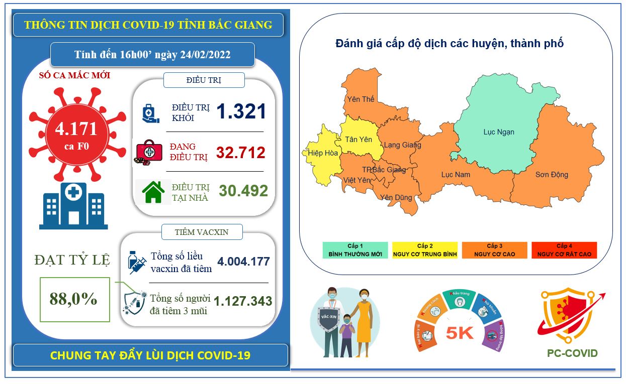 NLBBG - Theo Sở Y tế, đến 16h00’ ngày 24/02/2022, trên địa bàn tỉnh Bắc Giang ghi nhận 4.171 ca mắc mới COVID-19 (ca F0) và hơn 32.000 ca mắc đang điều trị.