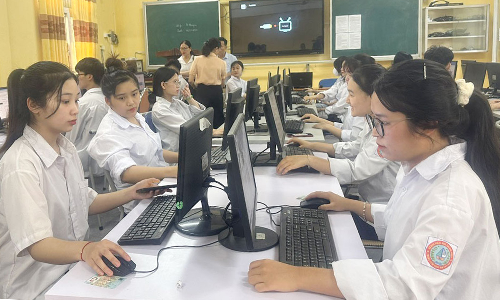 Học sinh Trung tâm Giáo dục thường xuyên - Ngoại ngữ, tin học tỉnh Bắc Giang đọc sách điện tử. |